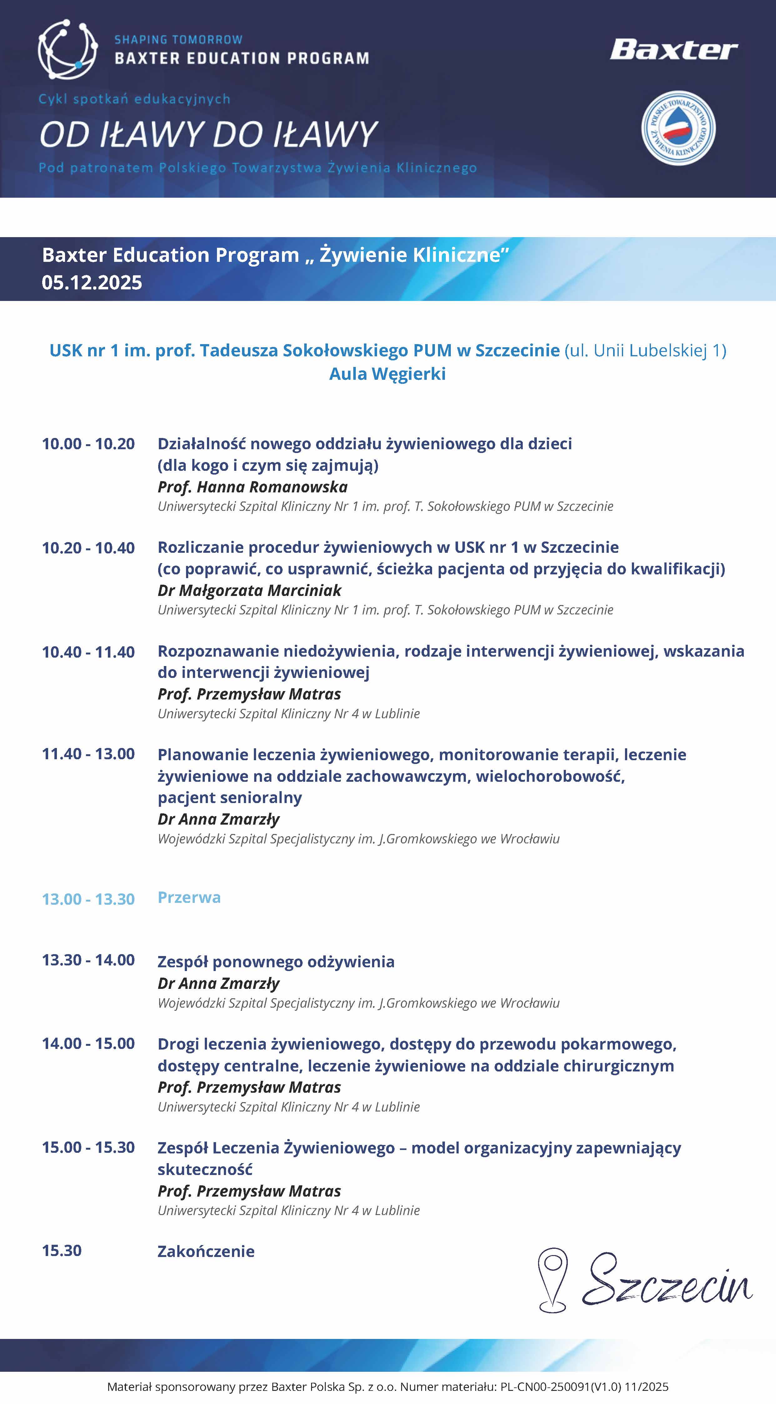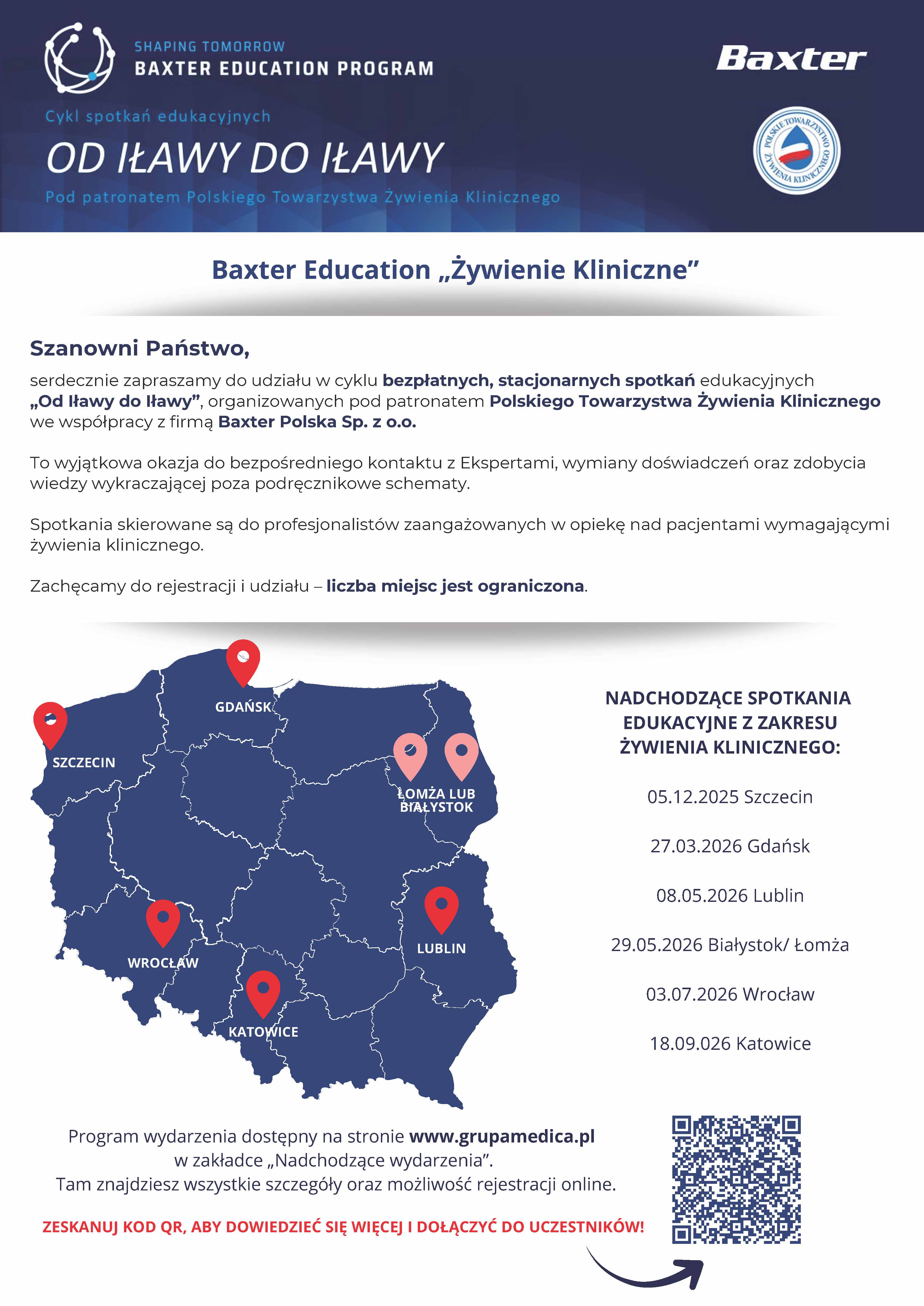 Serdecznie zapraszamy do udziału w bezpłatnym, stacjonarnym spotkaniu edukacyjnym z cyklu „Od Iławy do Iławy”, organizowanych pod patronatem Polskiego Towarzystwa Żywienia Klinicznego we współpracy z firmą Baxter Polska Sp. z o.o. To wyjątkowa okazja do bezpośredniego kontaktu z Ekspertami, wymiany doświadczeń oraz zdobycia wiedzy wykraczającej poza podręcznikowe schematy. Spotkanie skierowane jest do profesjonalistów zaangażowanych w opiekę nad pacjentami wymagającymi żywienia klinicznego.